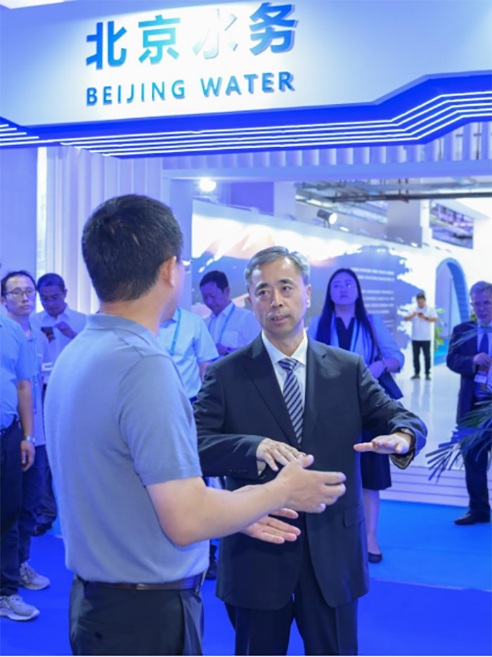 9月13日,水利部总规划师吴文庆参观北京水务展台,市水务局总规划师刘洪伟陪同介绍