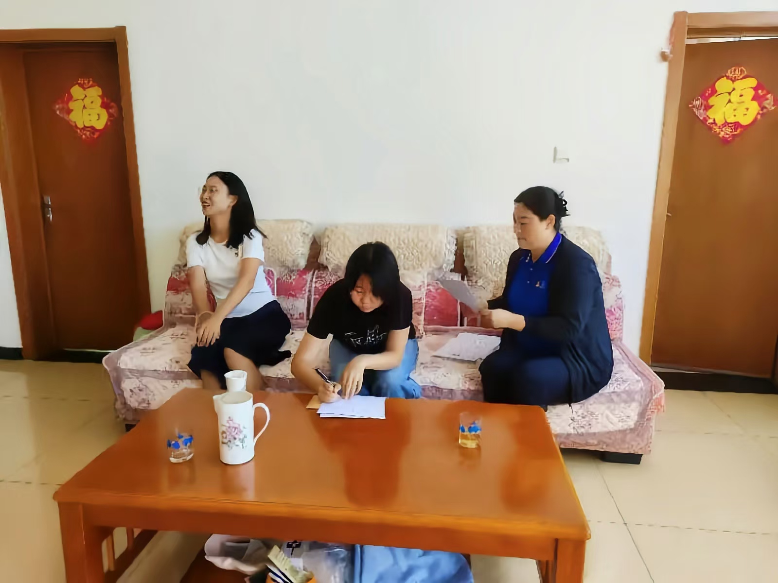 大峪沟村党支部书记苏月华(左)、大学生周子仪(中)、 京燕公司党委办公室主任栗新